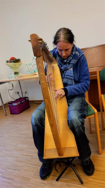 Herr Perdikomatis, Vertreter des Seniorenbeirats, begleitete die Lesung ausgesprochen zugewandt, herzlich und wertschätzend. Der Lyriker Holger Küls moderierte die Veranstaltung mit leichter Hand, dabei treffsicher, einfühlsam und Wesentliches hervorhebend. Die Texte der Sieben in der Lyrikszene nicht ganz unbekannten kreisten – bei aller inhaltlichen und stilistischen Unterschiedlichkeit und Vielfalt – um die gemeinsame Frage: Was bedeutet das Schreiben, welche Beweggründe nähren und tragen es, mit welchen Mitteln sucht es seinen stimmigen Selbstausdruck und wie kann der Dialog mit einem Gegenüber gelingen? Die Lesenden fühlten sich willkommen geheißen und erlebten in einer schönen Atmosphäre eine aufmerksame Zuhörerschaft. Es zeigte sich, dass Gedichte vielleicht doch mehr (be-)wirken, als man gemeinhin denkt … Eine Zuhörerin bemerkte nach der Lesung: „Ich gehe mit vielen Bildern im Kopf nach Hause.“ Ein Zuhörer sagte, er sei „geradezu begeistert“. Dieser Resonanz entsprechend, wurden einige Exemplare der vorgestellten Anthologie mit auf den Heimweg genommen. Anerkennung fand auch das gekonnte Harfenspiel der Lyrikerin Sigune Schnabel (s. Foto), die mit zarten, weichen Klängen dem Publikum die Möglichkeit gab, zwischen den Wortbeiträgen innezuhalten und das Gehörte nachschwingen zu lassen.